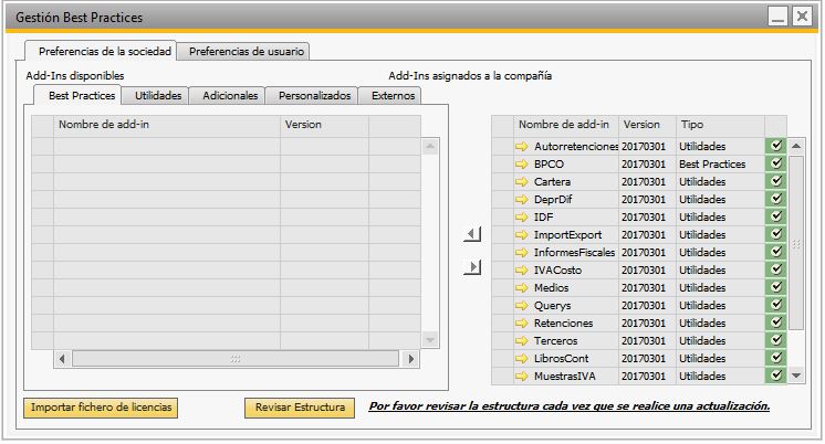 Desde esta pantalla se definen las distintas herramientas del add-on best practice que debe configurar el usuario en SAP Bussines One para el adecuado funcionamiento de los procesos de su empresa.