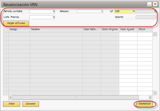 Cuando se cargan los artículos a revalorizar estos estarán seleccionados por defecto, el botón desmarca todos los artículos para que el usuario pueda seleccionar los requerido. |
