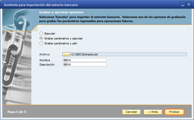 - Seleccione “Grabar parámetros y ejecutar” para grabar los parámetros ingresados para ejecuciones futuras e importar el extracto bancario.
