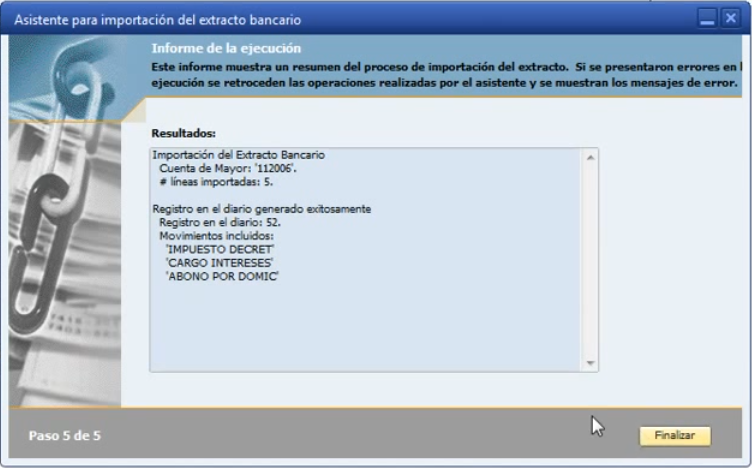 Este informe muestra un resumen del proceso de importación del extracto y generación del registro en el diario. Si se presentaron errores en la ejecución se retroceden las operaciones realizadas por el asistente y se muestran los mensajes de error.