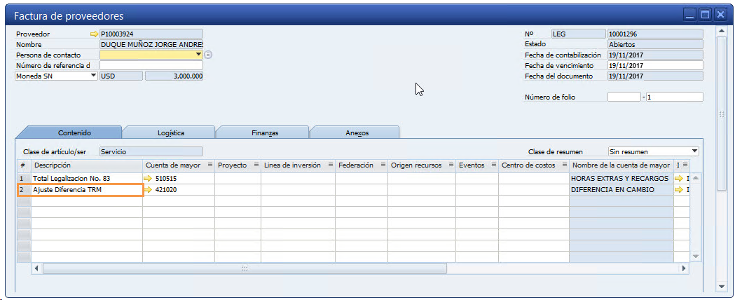 Una vez ingrese todos los documentos de la legalización en moneda extranjera seleccione la opción "Crear Doc. Lineas", el formulario registra las facturas de acreedores y los pagos efectuados.