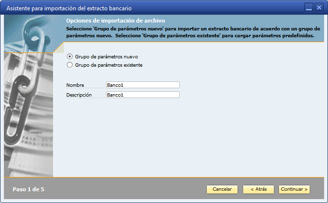 Seleccione “Grupo de parámetros nuevo” para importar un extracto bancario de acuerdo con un grupo de parámetros nuevo. Debe ingresar un nombre y descripción para el grupo de parámetros.