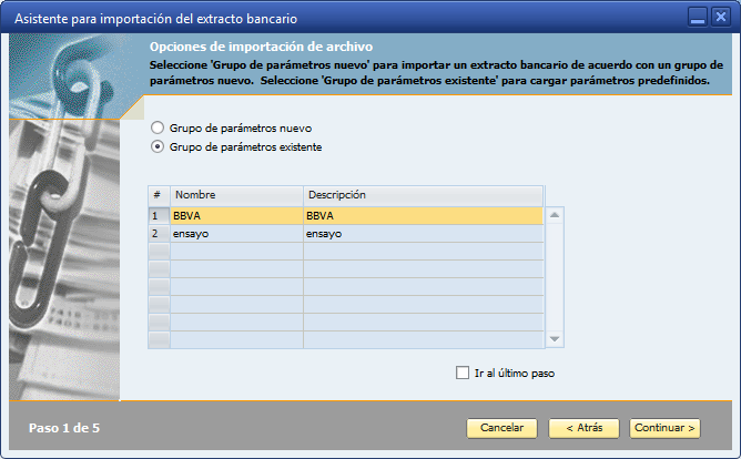Seleccione “Grupo de parámetros existente” para cargar parámetros guardados previamente. Seleccione el grupo de parámetros que desea cargar. Si activa la opción “Ir al último paso” el asistente lo llevará a la última pantalla para ejecutar la importación del archivo. De lo contrario el asistente lo llevará paso a paso permitiendo visualizar y modificar los parámetros actuales.