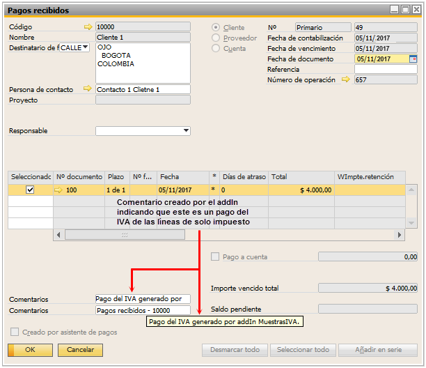Si la factura sólo contiene filas marcadas como Sólo Impuesto, el documento queda cerrado. De lo contrario, la factura queda abierta por el saldo pendiente. El campo de usuario IVA x muestras pagado muestra el valor SI.