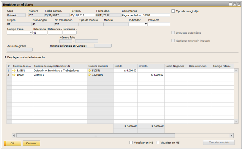 El asiento contable del pago generado (En la factura, clic derecho "Registro en el diario") muestra el registro del pago, en el campo "Comentarios" se visualiza el número de la factura paga.