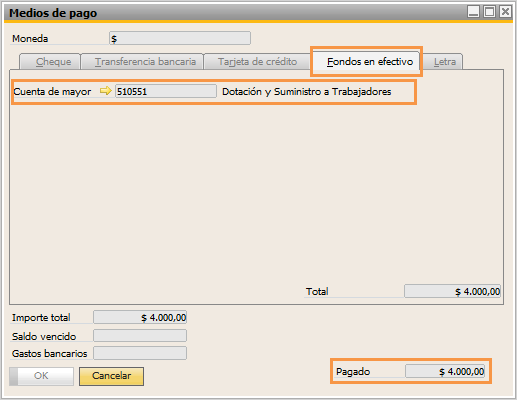 El pago se crea utilizando como medio de pago Fondos en Efectivo.