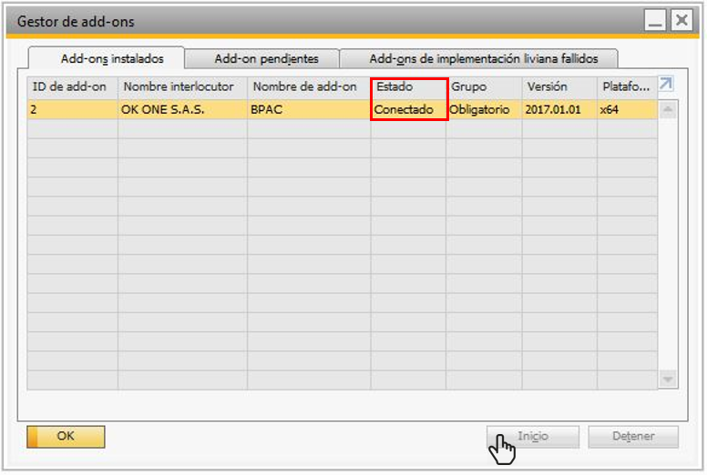 Debe instalarse la versión de AddOn correspondiente para el ejemplo se encuentra instalada la versión 2.0, ir a: Gestión > add-ons > Gestión de add-ons.