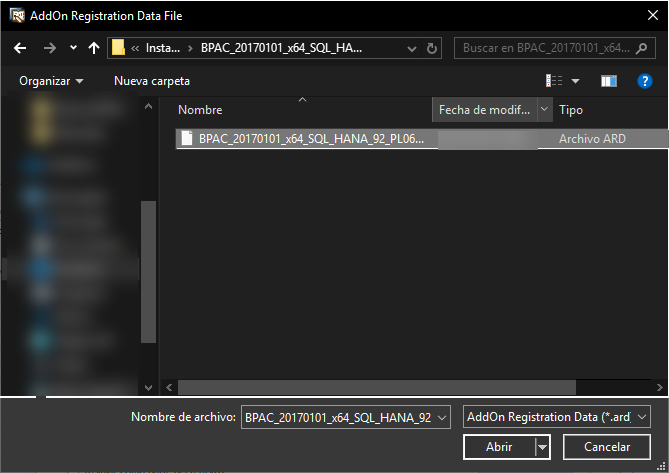 - Para iniciar el proceso de instalación, se debe ingresar a SAP y registrar el archivo “BPAC_20170101_x64_SQL_HANA_92_PL06”}