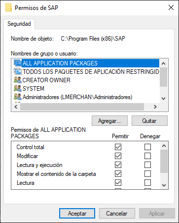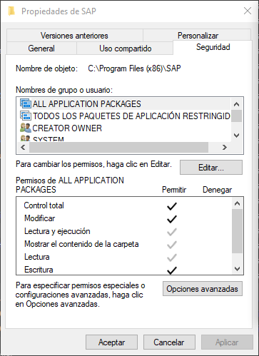 Validar que la carpeta SAP en la ruta “C:\Program Files (x86)” tenga los permisos de edición habilitados