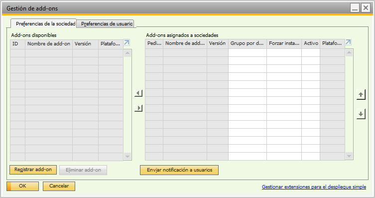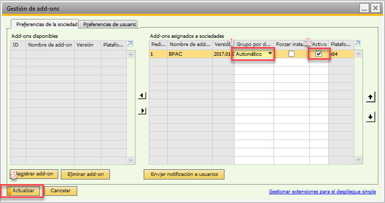 - En la ventana “Gestión de AddOns”, seleccionar la forma en la cual se desea que inicie el AddOn (Manual u Automático), validar que el ckeck “Activo” se encuentre seleccionado y pulsar botón “Actualizar”.