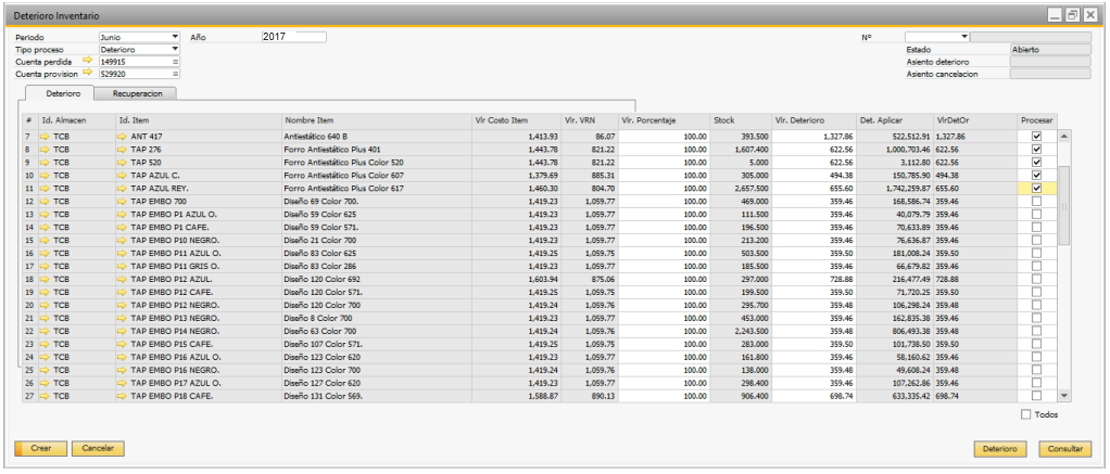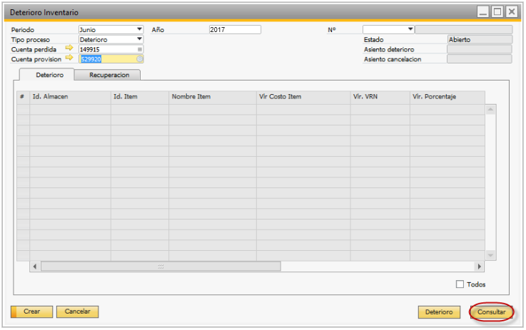 Nota: Debe crear los documentos Deterioro de inventario y sus correspondientes asientos de deterioro secuencialmente con el fin de que no se salten los periodos. Lo anterior se debe también a que durante la creación del asiento de deterioro la funcionalidad buscará el ultimo documento al que se le ha creado un asiento de deterioro para cancelarlo.