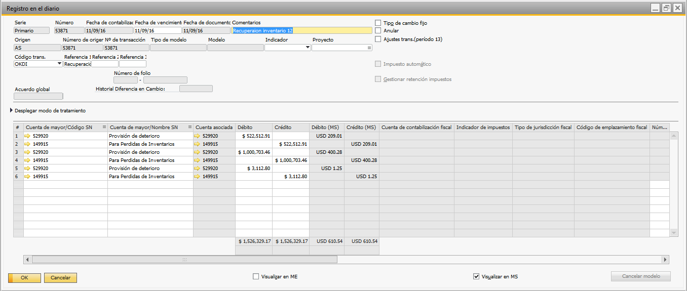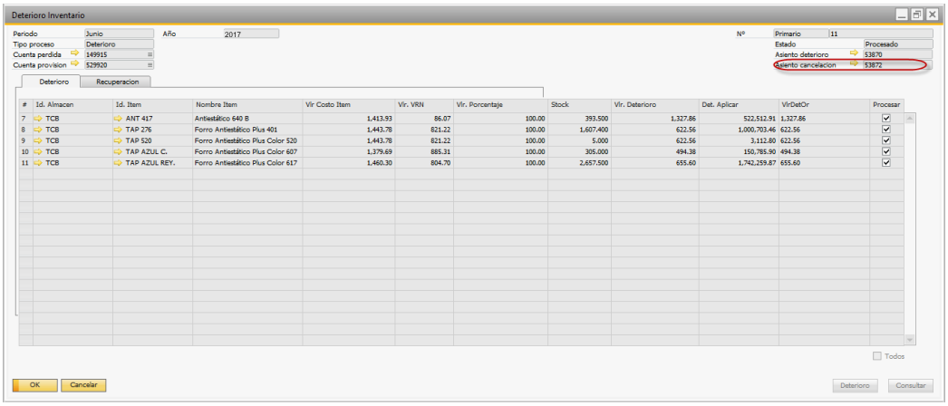 Después de ejecutar el proceso de deterioro el sistema automáticamente registrará el número del asiento de diario con el movimiento. |