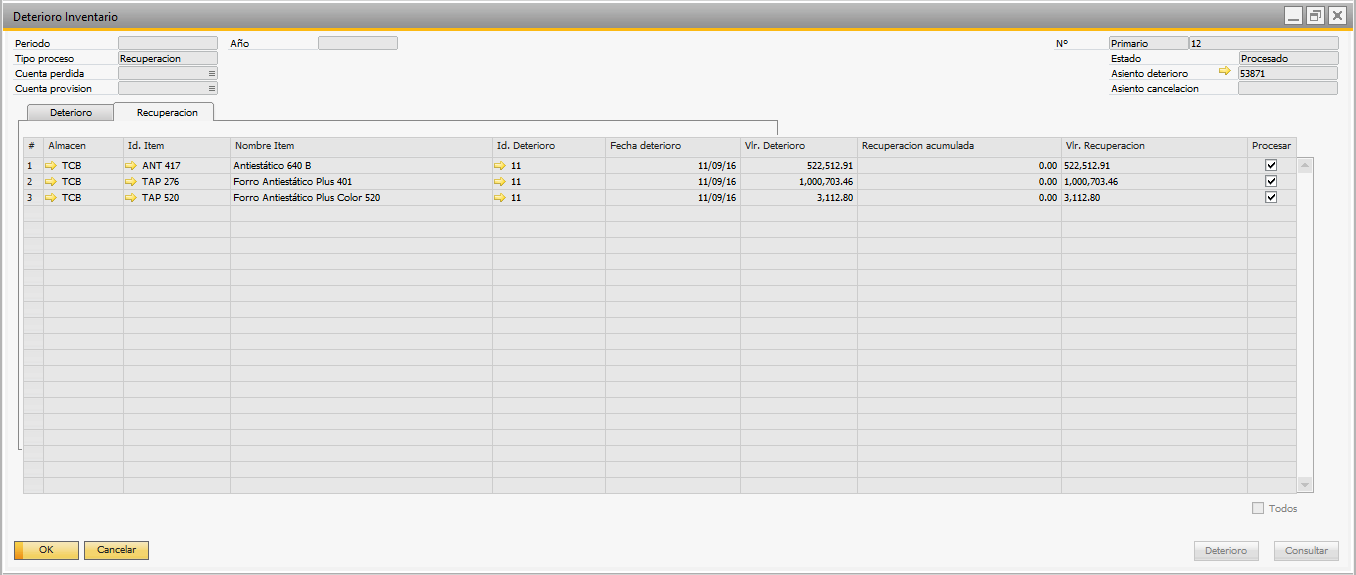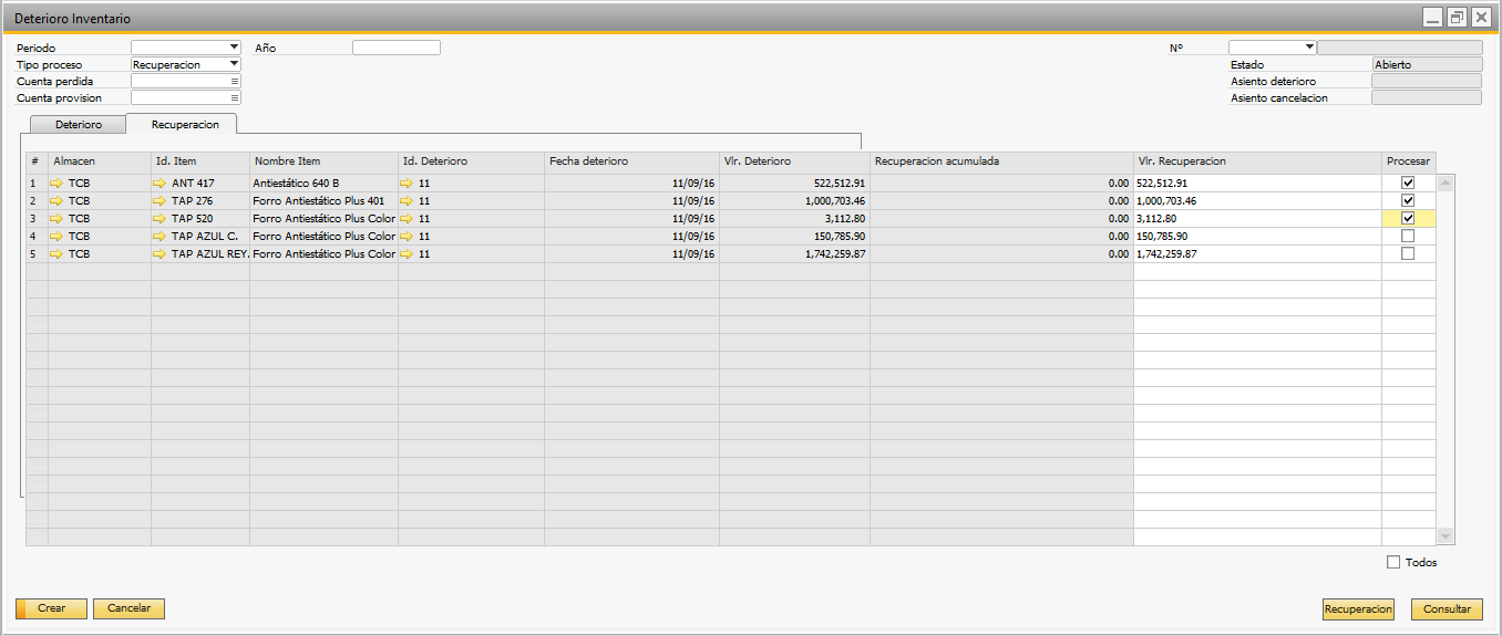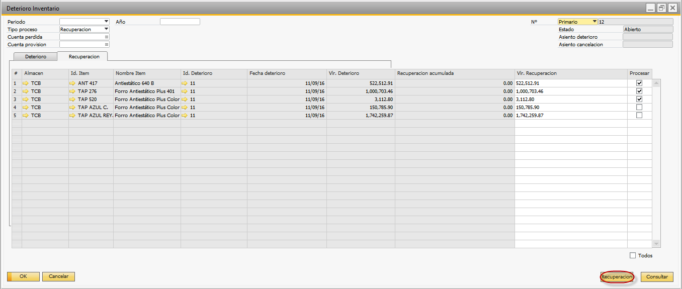 Desde este formulario puede aplicar recuperación a los artículos a los cuales ya le aplicó deterioro. El sistema listará automáticamente las líneas del ultimo deterioro creado.