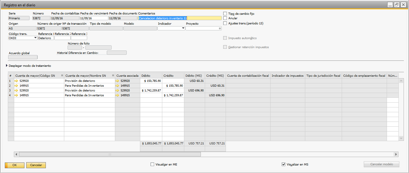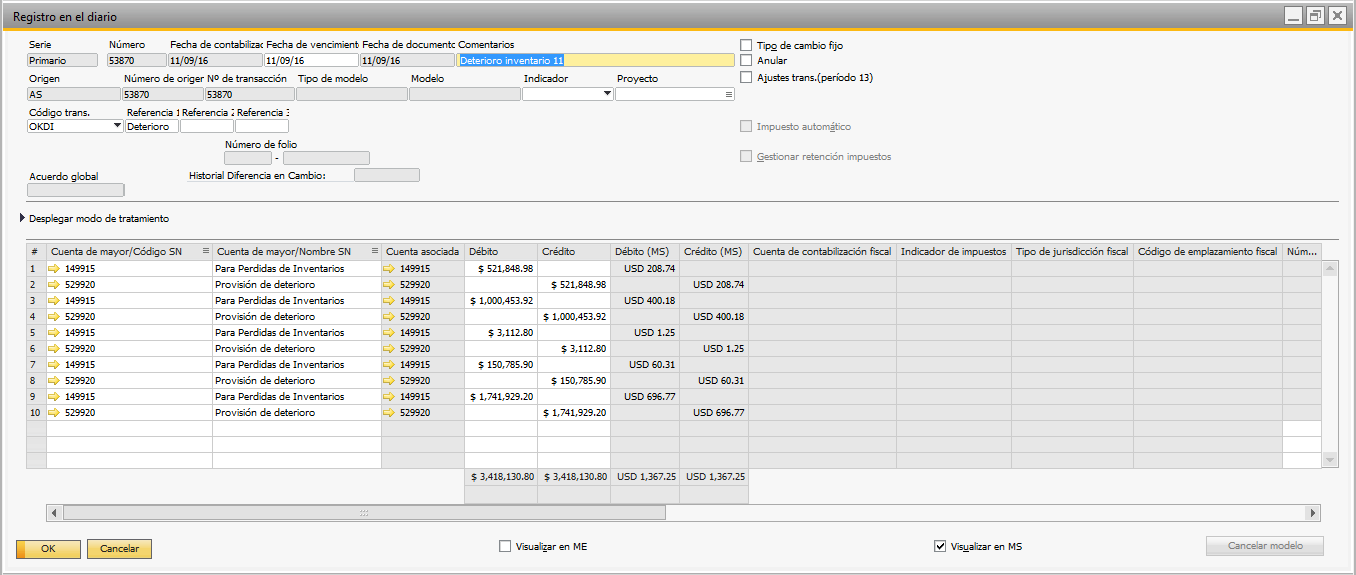 Registro de diario generado para el deterioro.