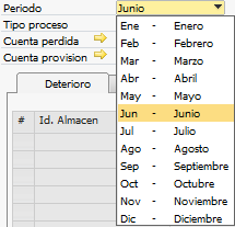 Seleccione el periodo correspondiente, si el periodo ya existe para el mismo año en otro documento de deterioro, al consultar, el sistema no permite continuar con el proceso e informa por un mensaje que ya existe un deterioro para ese periodo. Los periodos que se listan dependen de lo parametrizado en la tabla Cfg VRN y Det. Inventario