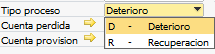 Seleccione si realizará un deterioro o una recuperación de inventario. Para el proceso de recuperación no es necesario seleccionar un periodo ni cuentas.