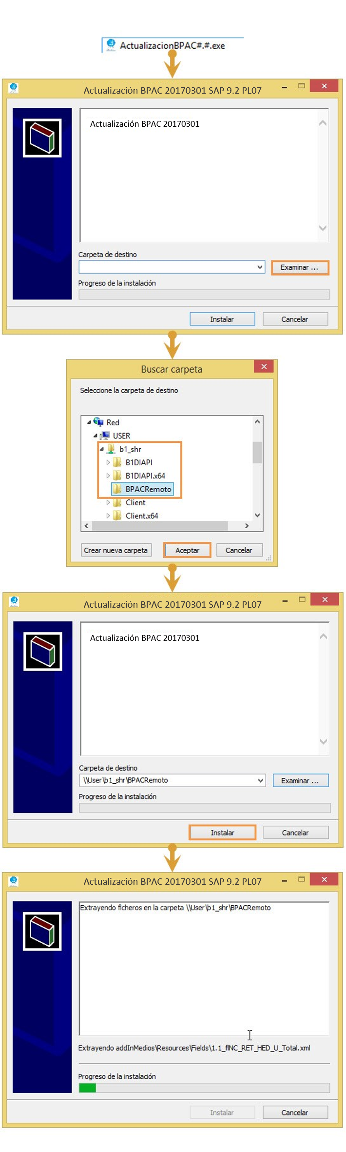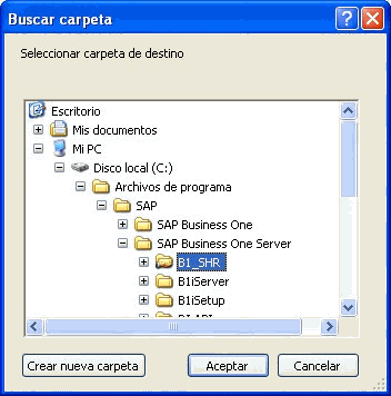 Nota: Si se ha migrado desde la Versión 2005 de SAP Business One es posible que la carpeta B1_SHR se encuentre en una ruta distinta (En esta versión la carpeta B1_SHR quedaba ubicada en la ruta: C:\Program Files\SAP\SAP Business One\), a la instalada en versión 2007 A y posteriores, por lo tanto es importante en el momento de la actualización verificar que se esté seleccionando la ruta adecuada.
