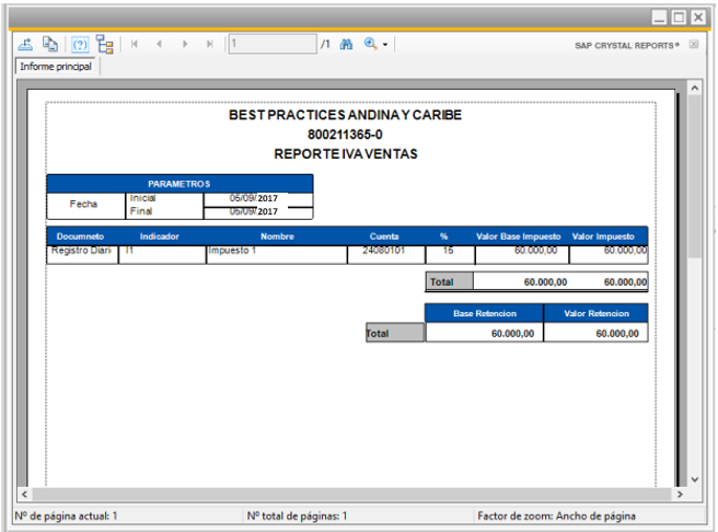 Como se observa en la imagen, el resultado de dicho reporte muestra el impuesto correspondiente al asiento manual de ventas que fue generado y al cual se le asignaron los códigos de impuesto, tarifa y base.