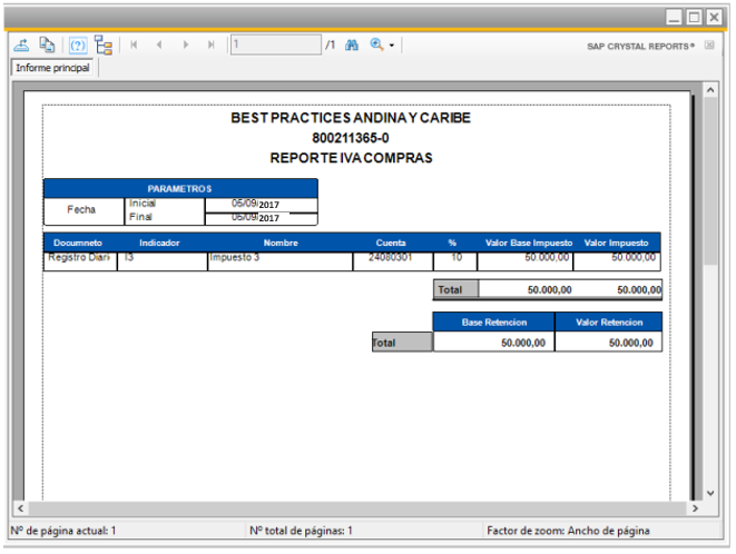 Se basa en la misma parametrización para el reporte de IVA Ventas, sin embargo el resultado presentado hará referencia al código de impuesto en compras, asociado al asiento manual creado previamente.