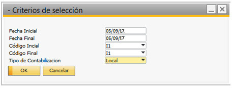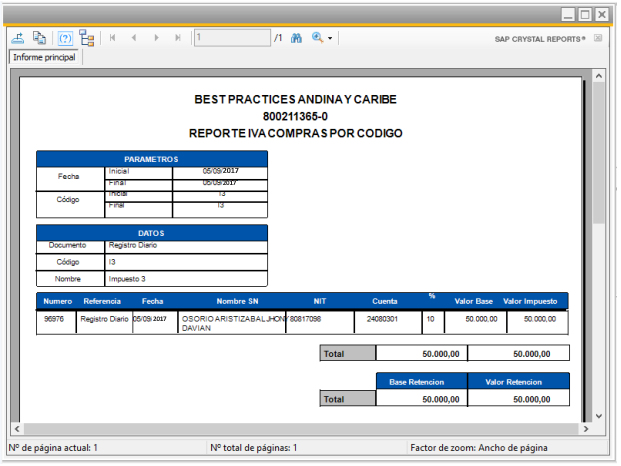 Para este reporte se debe tener en cuenta que en los campos código inicial y código final debe ingresarse el código de impuesto asociado, de forma que la información se muestre correctamente.