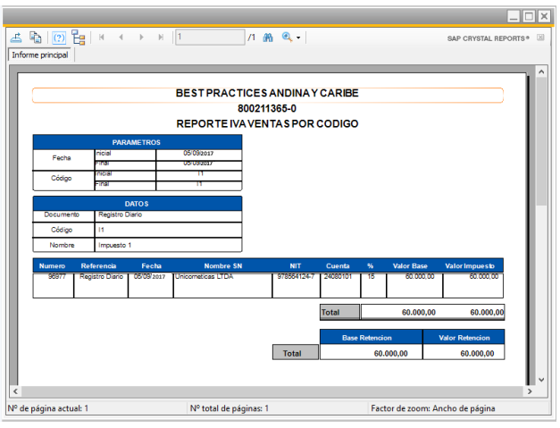 Al igual que para el informe de IVA compras por código, en este informe es importante indicar el código de impuesto de ventas asociado al asiento manual creado, para que los resultados presentados en el informe sean los correctos.