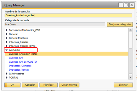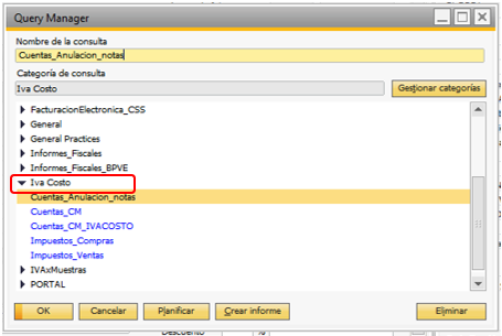 Presionar el Botón Query Manager , después IVA costo _ cuentas_anulacion_notas