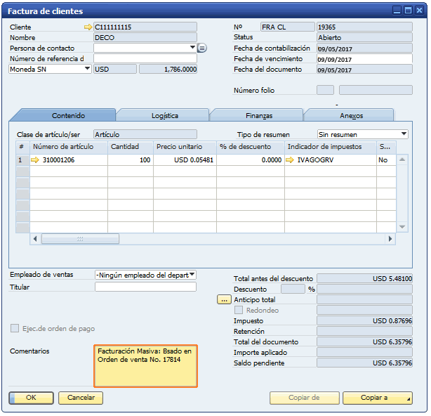 Después de utilizar el asistente se puede visualizar las facturas de ventas generadas, y en el campo “Comentarios” se describe en que documento se basó la factura.
