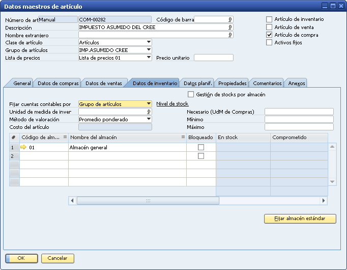 Es posible hacer el proceso de retenciones asumidas en una legalización. Primero, es necesario crear uno o más datos maestros de artículos para compras para ser usados en el proceso de retenciones asumidas.