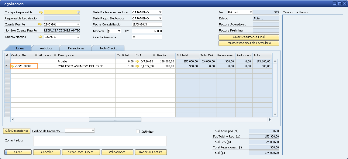 Después se procede a realizar una legalización. La línea debe tener retenciones asignadas, y después de crear las líneas con el valor de la retenciones calculadas, se crean una o más líneas que van a tener como concepto el artículo que tendrá el total de las retenciones asumidas. El tipo de IVA deben ser exento de dichas líneas.