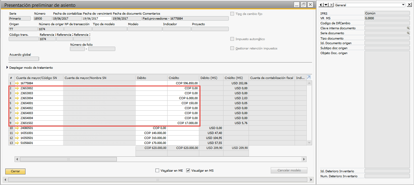 Por ultimo, al generar el documento y validar el asiento de diario la afectación contable de las retenciones estará asociada a la determinación realizada en la pestaña retenciones del documento: