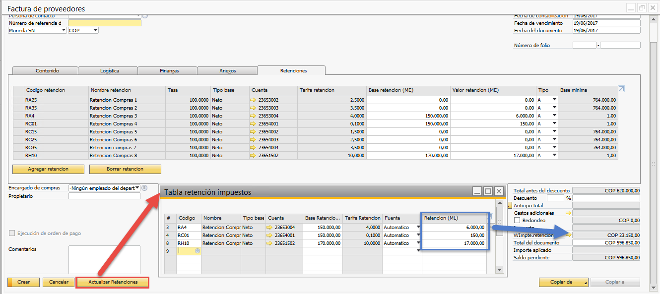 Si los valores se encuentran correctos al dar clic en el botón "Actualizar retenciones" la tabla de la pestaña "Retenciones" pasara a la tabla de retención de impuestos de la factura llevando el valor correspondiente al campo de retención del documento: