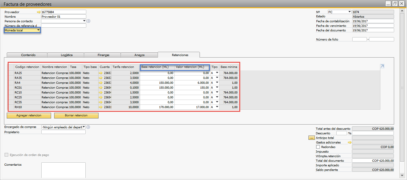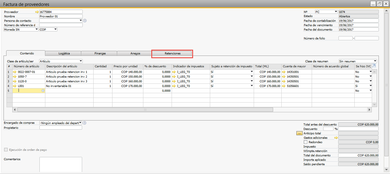Después de ingresar la información de la factura sobre la pestaña "Retenciones" ubicada en el documento encontraremos una relación de las retenciones aplicadas y la base de la retención asociada a los artículos. sobre dicha pestaña también se podrá visualizar información como el tipo de base (Neto-IVA), la cuenta asociada a la retención, la tarifa y base mínima.