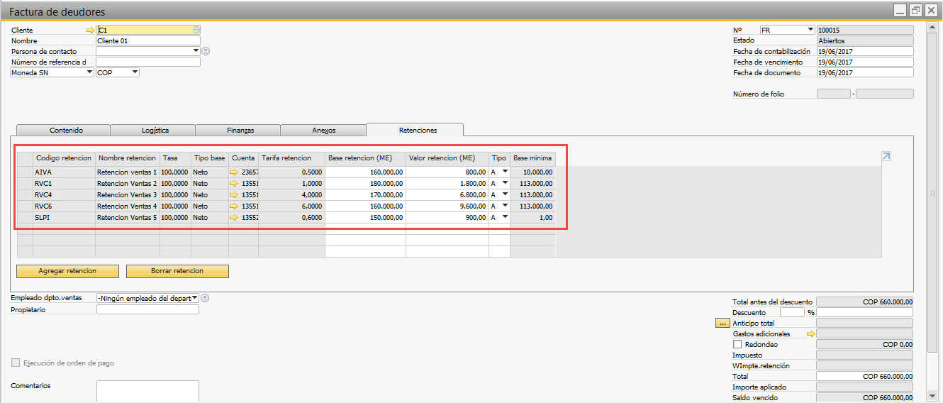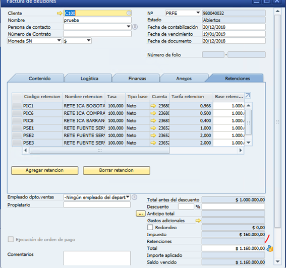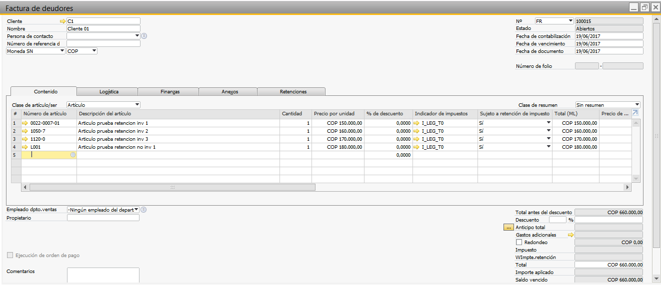 Una vez se tengan configuradas las retenciones a nivel tanto de articulo como de socio de negocios tipo cliente al ingresar a la factura de deudores ubicada en al ruta ventas - clientes > factura de deudores ingresaremos el socio de negocios y los articulos correspondientes a la venta:
