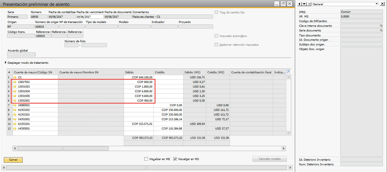 Por ultimo, al generar el documento y validar el asiento de diario la afectación contable de las retenciones estará asociada a la determinación realizada en la pestaña retenciones del documento: