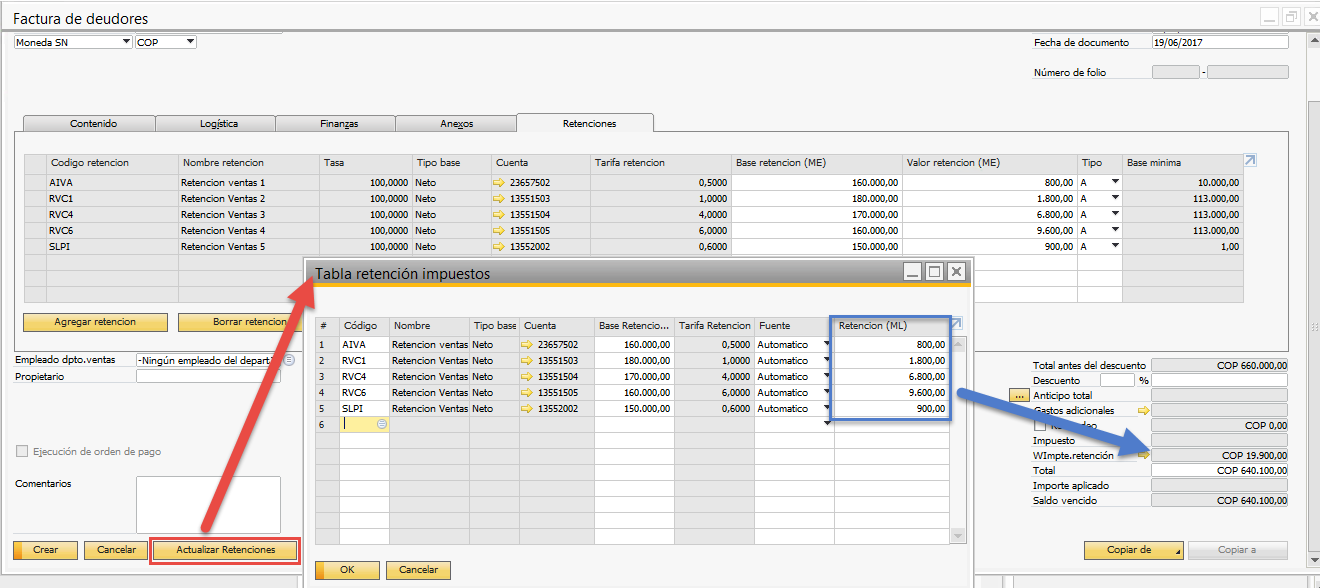 Si los valores se encuentran correctos al dar clic en el botón "Actualizar retenciones" la tabla de la pestaña "Retenciones" pasara a la tabla de retención de impuestos de la factura llevando el valor correspondiente al campo de retención del documento:
